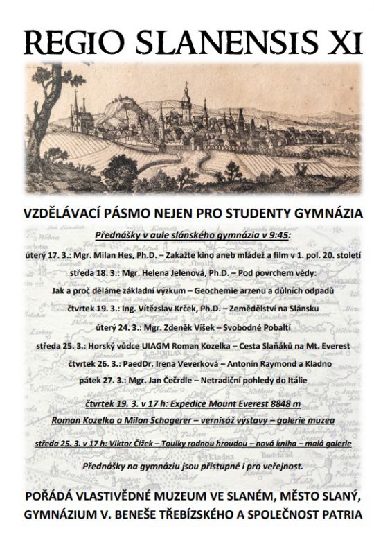 Ve dnech 17. 3. – 27. 3. 2026 se v aule slánského gymnázia uskuteční již jedenáctý ročník vzdělávacího cyklu Regio Slanensis, jehož pořadateli jsou tradičně Vlastivědné muzeum ve Slaném, Gymnázium Václava Beneše Třebízského a společnost Patria. V rámci této společensko-kulturní akce je připraveno pro studenty školy i slánskou veřejnost celkem sedm přednášek, které jsou zaměřeny nejen na historii našeho regionu, ale i na poznávání minulosti a přítomnosti Pobaltí, Itálie a Nepálu. Z. Víšek, předseda Patrie, z.s.